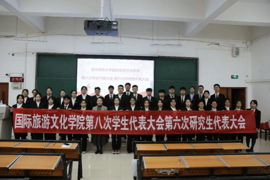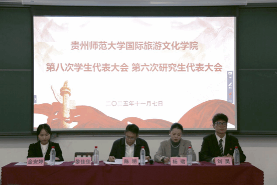 11月7日下午18:30,国际旅游文化学院第八次学生代表大会暨第六次研究生代表大会在贵州师范大学公共教学楼6401召开。国际旅游文化学院党委副书记陈明老师、学生科副科长(团委副书记)杨珺老师出席本次大会,我院学生代表、研究生代表共计82名同学参加(62名正式代表,20名列席代表)。开幕式由第十七届学生会主席团成员黎佳佳同学主持。