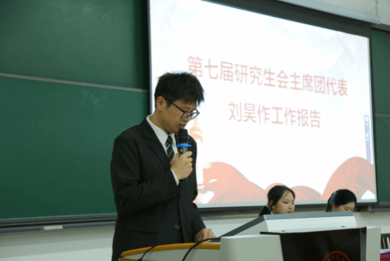 刘昊同学代表第七届研究生会主席团作题为《以青春之我,绘文旅新篇》的工作报告。