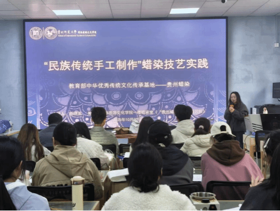 为使中华优秀传统文化绽放时代光彩,促进非遗技艺与青年群体深度交融、创新传承,点燃学生的劳动热情与创造潜能,让学生在锤炼劳动技能的过程中,达成以劳修德、以劳增智、以劳强体、以劳塑美的综合育人目标。国际旅游文化学院于2025年10月30日开展了第四期“非遗蜡染l守艺匠心——民族传统手工制作”蜡染技艺实践活动。活动由贵州师范大学教务处与教育部“中华优秀传统文化传承基地——贵州蜡染”主办,国际旅游文化学院承办,本次活动由杨晓英老师主讲,2023级至2024级全日制在校本科生参与。