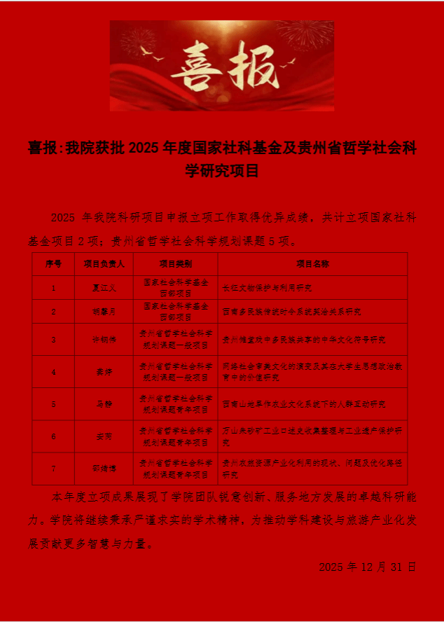 上一条:国际旅游文化学院学子马国祥等同学斩获首届贵州省文旅产品设计大赛银牌、铜牌设计官奖项 下一条:喜报:国际旅游文化学院申报《绣染织类非遗文创产品设计与品牌运营实务》获批2025年教育部宏志助航计划线上课程建设课题立项