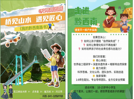 马国祥团队的获奖作品《桥见山水·遇见匠心》,选取兴义万峰林、马岭河峡谷等作为研学场景,融入花江峡谷大桥现代工程元素,专为10-15岁学生设计研学路线,以切实推动“研学赋能乡村、乡村反哺成长”的双向价值实现。吴冰玉团队的获奖作品《贵州遵义“红+酒”文化之旅》,以“酒文化”与“长征文化”为核心主题,面向19-35岁泛年轻群体,结合刮刮乐、盲盒答题及实景沉浸式体验等形式,打造符合年轻需求的红色文旅融合产品。