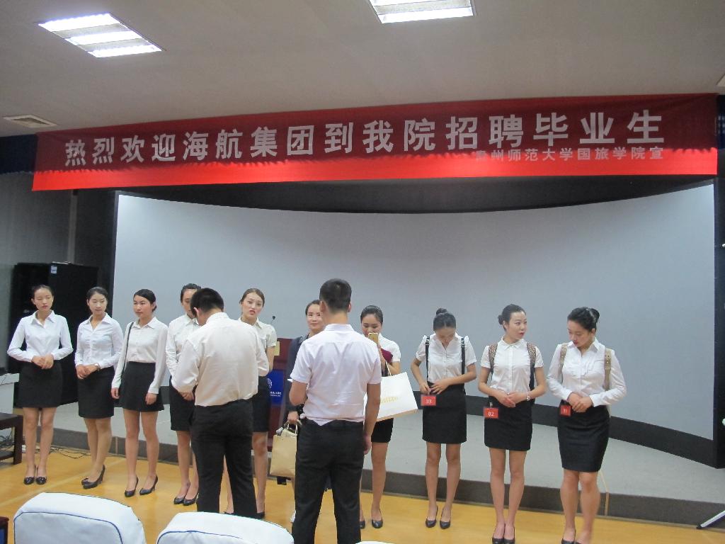 在2015届毕业生即将毕业之际,国际旅游文化学院党政多方联系单位到学院进行招聘,拓展就业渠道,向企业推荐优秀毕业生,这也是学院旅游文化月的重要工作之一。经学院联系,5月28日,海南航空公司来我院进行专场招聘,学院党总支副书记梅应贤全程陪同。海南航空公司成立于1993年1月,起步海南省,致力于为旅客提供全方位无缝隙的航空服务。此次招聘主要是针对我院音乐学(航空及高级综合服务管理方向)、旅游管理(酒店管理方向)、英语(旅游英语)等专业的三、四年级同学。有近200名同学参与,海南航空公司按照标准对前来应聘的同学进行考核,学院多名同学通过初试筛选,脱颖而出,进入海南航空公司复试体检环节。