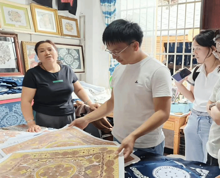 调研的最后一站是布依石头寨。在这里,同学们有幸邂逅了壮丽的自然河景与古老的水车,更难得的是,拜访了蜡染非遗传承人伍琴大师。伍大师热情分享了她的创新实践:将苗族蜡染的构图奔放与布依族蜡染的纹样细腻相融合,探索传统技艺在当代的创造性转化。她的故事是“非遗传承人”主体能动性的精彩呈现,展现了非遗在创新中永葆生机的可能。然而,与伍大师的创新活力形成对比的,是石头寨整体旅游开发的困境。同学们观察到,景区试图模仿网红模式,引入了大量与本地文化基因不符的元素,导致独特的“石头寨本味”被稀释,同质化严重,最终门庭冷落。这一现象引发了大家的深入思考。