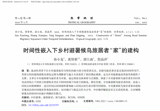 近日,由我院孙小龙教授、硕士研究生黄贤桥、唐江南、詹晶萍共同完成的研究成果《时间性嵌入下乡村避暑候鸟旅居者“家”的建构》被CSSCI扩展版、CSCD核心、北大核心期刊《热带地理》接收并发表。研究从历时性变迁与时间域视角,探讨了季节性流动中“家”的建构机制及功能演化,为理解家与地方关系提供了新的理论视角,也为乡村旅游地高质量发展提供了支撑。