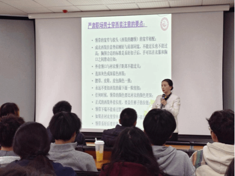 随后,吴佳妮教授针对严肃职场着装规范展开细化讲解。在男士着装部分,聚焦“三个三”原则与中国男士社交的八个关键细节,并围绕男士正装“五长度”标准,现场邀请一名男同学上台作为模特进行直观演示,让理论知识更易理解。在女士严肃职场着装部分,则明确袜子、首饰搭配要点,指出“过分杂乱、鲜艳、暴露、透视、短小、紧身”六大着装禁忌,为同学们划定了职场着装“红线”。