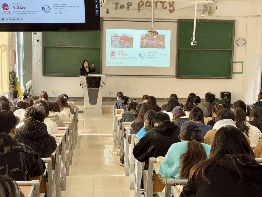 在互动交流阶段,同学们围绕“非遗品牌的破圈策略”、“传统工艺如何融入现代消费场景”、“文化IP可持续运营机制”等核心问题踊跃发言。金英老师援引“草莓节”、“黄桃直播带货”及“状元游局”等代表性实战项目,针对性地回应了每个提问,并进行了深入剖析。她特别指出,非遗在当代的存续与发展,其核心活力不仅依赖于保护传承,更在于能否有效融入日常、唤起共情体验并创造可持续的商业价值。整场讲座凭借其丰富内容、生动案例和热烈互动,赢得了现场持续不断的掌声。