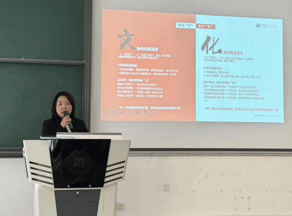 2025年10月28日,国际旅游文化学院特邀贵州一村百坊运营管理有限公司董事长、贵州与共文化产业有限公司总经理金英女士,在5102教室主讲《从“文”到“化”的产业之路——寻文·解码·活化三部曲》专题讲座。产品设计(2023级、2024级)、文化产业管理(2023级、2024级)四个本科班学生,以及职业技术教育、非物质文化遗产学专业研究生参加了本次活动。
